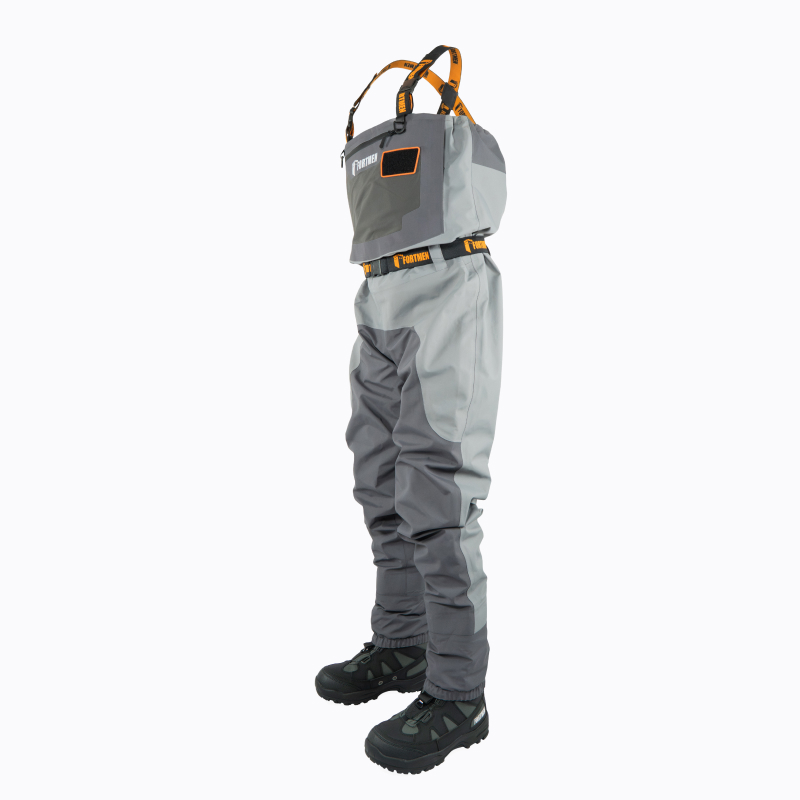 - Регулируемая эластичная утяжка по верхнему краю вейдерсов снабжена фиксаторами, позволяющими оперативно адаптировать объём по груди под индивидуальные параметры пользователя. Такая конструкция не только повышает комфорт, но и служит дополнительным барьером против проникновения воды внутрь экипировки.